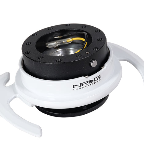 Introducing SRK-700BK-WT our new generation 4.0 Quick Release with its new sleek design inspired from racers all around the world that offers style and functionality that surpasses all previous versions. With the addition of the two larger levers, steering wheel removal has never been easier. The generation 4.0 utilizes the same patented ball and lock mechanism found in the previous versions. Features a Black body with a White ring for added style and look to match your vehicle.