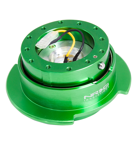 The SRK-250GN Quick Release utilizes all the features of the Second Generation Systems ball-locking quick release system engineered with raised sections to prevent the scratching and stretching of the hub while a self locking feature adds increased safety and functionality, with the added benefit of an upgraded flared ring. This allows much easier release for the steering wheel by providing added leverage and grip onto the pull ring. Features a green body with a green ring for added style and look to any vehicle. Perfect for race applications where the use of gloves are required.